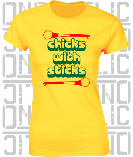 Chicks With Sticks, Camogie Ladies Skinny-Fit T-Shirt - Carlow