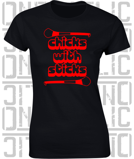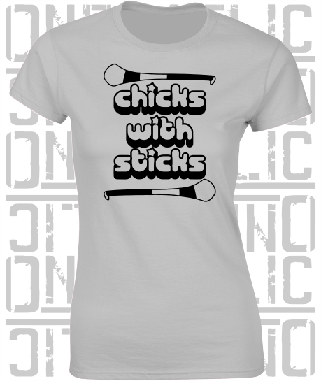 Chicks With Sticks, Camogie Ladies Skinny-Fit T-Shirt - Down