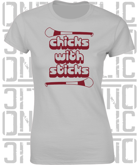 Chicks With Sticks, Camogie Ladies Skinny-Fit T-Shirt - Roscommon