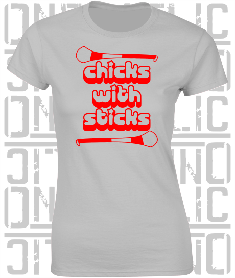 Chicks With Sticks, Camogie Ladies Skinny-Fit T-Shirt - Tyrone