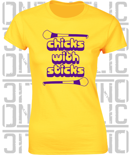 Chicks With Sticks, Camogie Ladies Skinny-Fit T-Shirt - Waterford