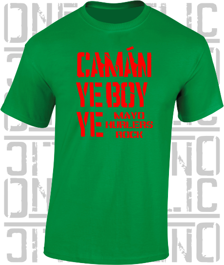 Camán Ye Boy Ye - Mayo Hurlers Rock T-Shirt in Adult sizes.