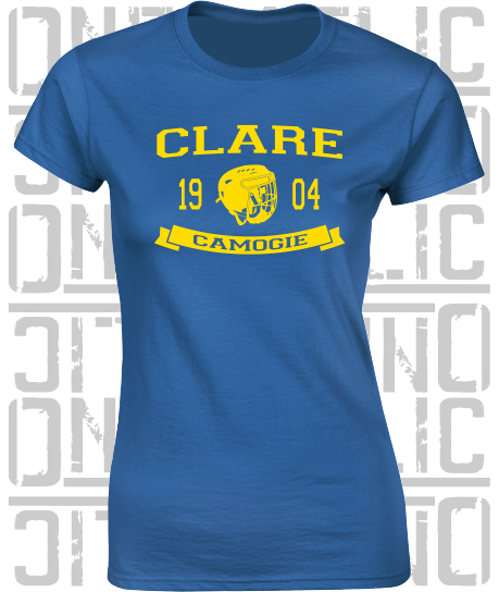 Clare Camogie Helmet Design T-Shirt in Ladies Skinny-Fit Sizes.