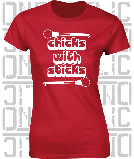 Cork Chicks With Sticks Camogie T-Shirt in Ladies Skinny-Fit Sizes.