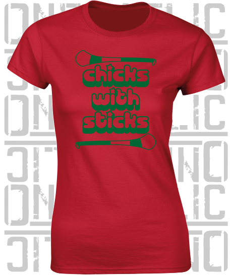 Chicks With Sticks, Camogie Ladies Skinny-Fit T-Shirt - Mayo