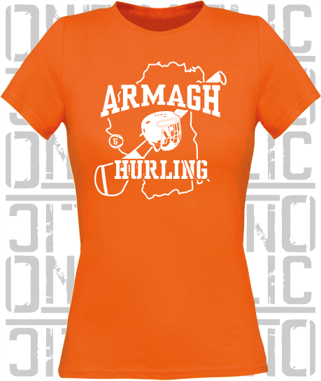 Armagh Hurling T-Shirt featuring the County Map Outline, in Ladies Skinny-Fit sizes.