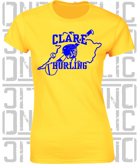 Clare Hurling T-Shirt featuring the County Map Outline, in Ladies Skinny-Fit sizes.